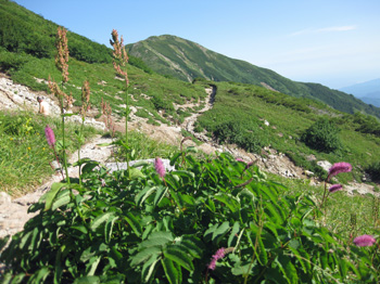 | お花畑の中を雪倉岳へ | 雪倉避難小屋 |