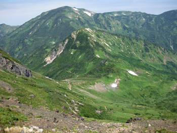 | 三国境から雪倉岳に向かう。 | 雪倉、朝日岳を見ながら |