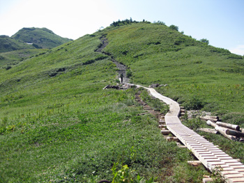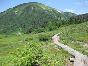 | 雪倉岳から600b下って朝日岳へ | 小桜ガ原の木道を進む |