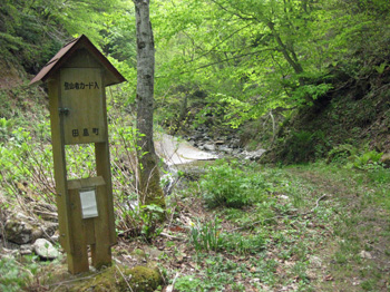 すぐ先の橋からは荒れた林道になって10分位歩くと林道は終り登山ポストが立っていた。