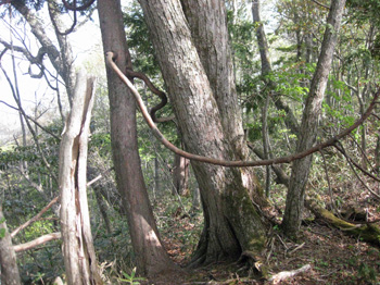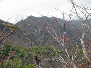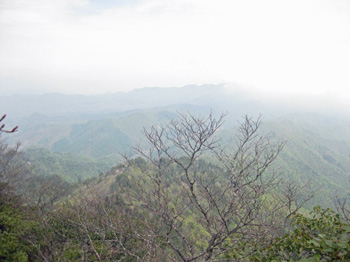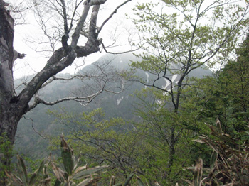 笹原の両側はまだ雪がビッシリで、雪が溶けたばかりのドロンコの急斜面に出た。長い綱も泥だらけ、木の根にしがみつきながら登り切り又、笹をかき分け進む。樹林帯から抜け出し展望がよくなった。荒海山も目の前に見え、次郎山、そして振り返ると歩いてきた尾根道がかすんで見えた。