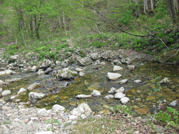 ポストからすぐに川を渡り沢沿いの登山道を進む。