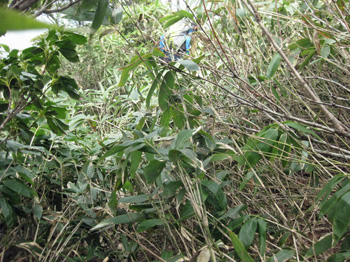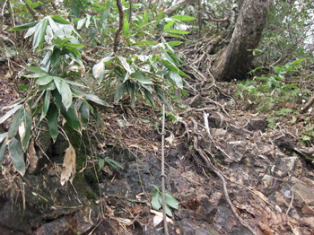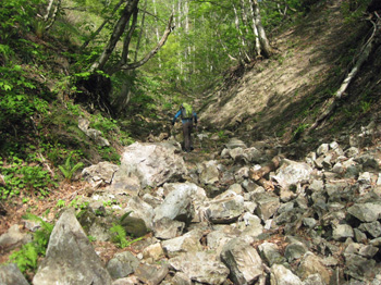 丁度、5人の若いグループが荒れた林道に車を止めようとしていたので、お先にと挨拶して7:19分スタート。 沢沿いを15分進んで沢を徒渉、砂防ダムを跨ぎ尾根への急登になった。石のゴロゴロ沢を登り、泥の急斜面を横切り、そして登る。