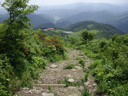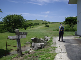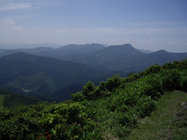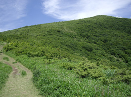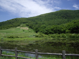 | 午前中は道後山に登っていたので、お昼に休暇村吾妻山の宿舎に着いた。 ここにはキャンプ場もあり、 すでに1000bの高さの所で行楽客も多いようだ。 今日は抜けるような青空。休暇村宿舎の脇を廻りこむと広々とした草原の丘陵が広ろがった。 近年まで牛の放牧が行われていたという草原は、手入れが行き届いていてとても気持ちよく、 その中に続く踏み跡は緑に囲まれた開放感で身も心も軽やかになってくる。 吾妻山の山頂を見ながら池のそばを通り、灌木帯に入る。 歩きやすい道は眼下に池を見下ろしながら展望の良い登山道で、そして間もなく山頂に着いた。 吾妻山山頂は360°の大展望で30分位の登りで中国山地の山並みが一望できて素晴らしい所だ。 帰りも楽しみながら往路を下る。 |