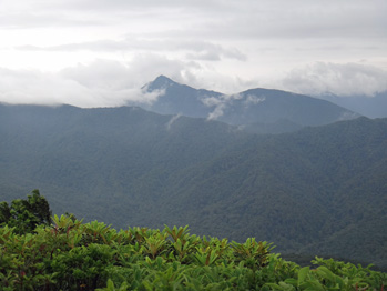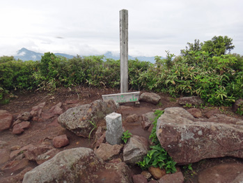 女岳は雲の中で見えないが思いがけず那須方面の展望が広がっていた。雨が降りそうなので男岳だけで戻ることにした。