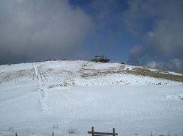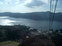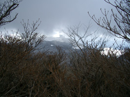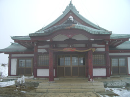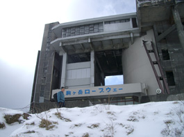 | 今日は天気が悪く、ガスがかかっている上にとても寒い。足元に芦ノ湖を見ながら7分程乗ると駒ヶ岳頂上駅に到着。先程一人の男性が乗っていたが人影もない。頂上駅はすっかり雪景色になっていた。遠くに箱根元宮神社が見え、 そこに向かって雪の中に足跡が通っている。 箱根元宮神社が駒ヶ岳の最高峰なので参拝し、神山へと進む。 |