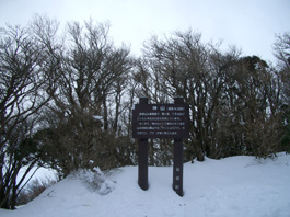 | 駒ヶ岳から笹原の中を下るが登山道は一面の雪で、こんなに雪があるとは思わなかった。灌木帯になって鞍部に出る。十字路になっていて、神山へは直進で登りになった。道は凍った登りで滑る。アイゼンをはいた男性が下りてきた。アイゼンを付けていた方が滑るようだ。広場に出て一等三角点の山頂に到着。樹間や樹上から景色が見えるが 今日はガスっているのではっきりしない。富士山が見えていないのがとても残念だ。15分休んで往路を下る。 |