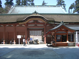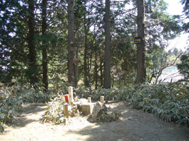 | 比叡山は2回訪れているのに、山頂にはまだ行っていなかった。 今回桜の時期に来て、阿弥陀堂の前で結婚式の写真を撮っていた若いカップルに見とれながら山頂に行ってみようということになった。 阿弥陀堂と東堂の間を抜けて、上に行く道を探し、杉林の中ともかく上を目指して登っていくと、 アンテナのある所に出た。コンクリート建物の横から10bほど入ると山頂に到着。 一等三角点の山頂は林に囲まれ、こじんまりとひっそり静かだった。 根本中堂や阿弥陀堂のにぎわいから15分位で別世界にきたような比叡山山頂だった。 |