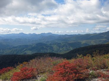 5分位歩くと樹林が切れて展望が広がった。目の前には北泉ガ岳、そして明日登る船形山連峰が遠くに見える。