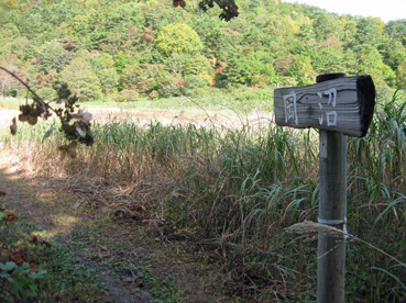 駐車場から道路をわたるとスキー場のゲレンデが目の前に広がり、左端の林に沿って道らしいのが見えた。