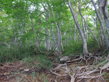 笹原を抜け、樹林帯に入り岡沼から1時間程で泉ガ岳山頂に到着。