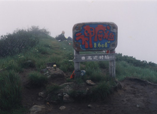 延々と急斜面を登る。750bを一気に上り、トドマツからダケカンバ林になりハイマツ帯になって標高1450bの国境稜線に到着。やっと尾根道も緩やかになり背が低くなったハイマツ帯を進んでゆくと灌木の草原の斜面になって神威岳山頂に着いた。ユーモラスな山頂標識が迎えてくれたがいつの間にかガスが立ちこめ展望は無。東京から来たという2人の男性が到着していてご苦労さんと声をかけてくれる。一緒にビールで乾杯。山好きな人達と楽しい一時を過ごし、40分程休んで皆で一緒に下ることになった。