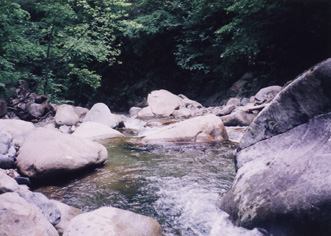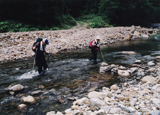ハイマツ帯から長い長い急な下り。沢に降り立ったときはホッとした。又、沢靴に履き替え河原歩きで、神威山荘に14:08分到着。神戸から来たというあのご夫婦はどうしたのだろう。道中あわなかったが帰ったのだろうか。神威山荘前の広場には私達の車2台しかとまっていなかった。 |