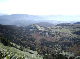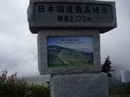 | 笠ヶ岳から下りて、国道292号線にはいって間もなく小さな駐車場に何台かの車が停車していた。 何があるのかなと降りてみると日本国道最高地点の2172bの石碑が建つている。 そして10人位のカメラマンがシャッターチャンスを窺っていて、眼下には素晴らしい風景が広がっていた。 ここは絶好の撮影ポイントなのだそうで、5分いる間にマイクロバスも止まり車も入れ替わりやってくる。思いがけず、 のどかで優雅な極上の景色を見ることが出来て何か得をしたような嬉しい気持ちになった。 |