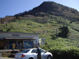 | 今日はまず笠ヶ岳を登り、それから斑尾山に行くことにした。 遠くから笠ヶ岳への上部に車が走っているのが見えたが、 熊の湯から登山口があると聞いていたので捜したがわからなく、 笠ヶ岳への標識が車道に大きく掲げてあったので、 それを見て進むと笠ヶ岳峠の登山口についた。峠の茶屋は閉まっていたが、車道脇の駐車場は広くここからの眺めも素晴らしい。 |