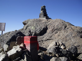 | 山頂は目の前で、8:45分峠の茶屋から丸太で組まれた階段を一気に登る。 階段は傾斜がきつく、15分ほどで階段が終わり、山頂直下の岩場を通過して笠ヶ岳山頂に到着。 山頂には二等三角点と石祠があり、大岩に上ると360°の大展望。9:09分の山頂は空気も澄んで別世界のよう。 30分足らずで2千bの地点に立てるなんて超楽チンコースだ。熊の湯から登るつもりだったので、ルンルン気分で下山。 誰もいなかったが峠に着くと相次いで3台の車が着き、 10人程の人が登り始めた。一組のご夫婦も熊の湯コースを捜しているうちにここに来ちゃったと話ししていた。 |
