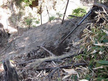 | 後袈裟丸に向かう道には通行止めの立て札があったがどこが駄目なのかなと思いながら笹をかき分けかき分け進むと道が落ちていた。