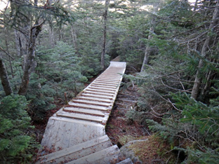 すぐに木道になり、夢の庭園への分岐を通り整備された木の階段を登って行く。