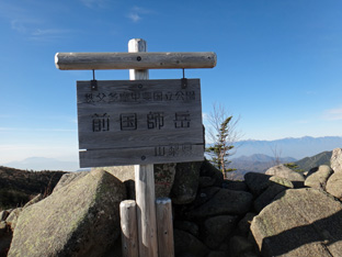 木々の背丈が低くなって樹幹越しに金峰山や遠くに南アルプスが見え、視界が開けてきた。前国師岳頂上に着いた。