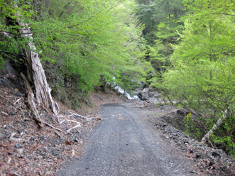 | 林道スタート地点 | 林道の様子(滝が見える) |