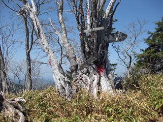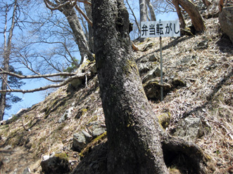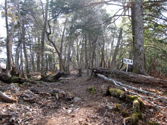 | 急登に立て札が | 尾根の樹につけられた標識 |