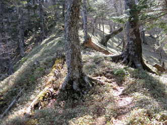 | 黒法師岳を眺めながら笹原の道を進む。笹原道は右に大きく曲がりそして又、崩壊場所にでた。足元から谷にめがけて崩れているガレ斜面の縁を進む。南アルプスの深南部の山々には斜面の崩壊があると聞いていたがすざましい崩れ方だ。ガレから笹原の道になって振り返ればまだ真っ白な聖岳や上河内岳まで遠望出来素晴らしい眺め。”バラの頭”への分岐標識が建っていてそこに向かうのどかな登山道を見送り、黒法師岳山頂に10:32分到着。登山口から3時間15分かかり、林道ゲートからは5時間5分かかっていた。 山頂は笹原の広々とした中に黒法師岳山頂標識が2つと有名な三角点が埋まっているだけだった。樹林に囲まれて展望はなく石ころが5〜6個転がっている山頂の樹の下にはまだ雪が残っていた。普通三角点標は+印なのに、ここの三角点標は×印になっているので三角点マニアには貴重な存在なのだという。一等三角点なのに埋もれていて低く、三角点標の角も丸くなっている。北の方角を確認して、40分程休む。 |