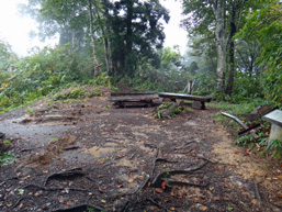 | 雷鳥バレースキー場のゴンドラ駅駐車場で登山靴に履き替えていると雨が降り出した。 予報では晴れるはずなのに、10分程で山頂駅に着いたが雨はいっそう強くなった。スタートからの雨に気が重く、ぐずぐずしていると 山頂の係員に最終は16時30分ですよと念を押され、8時50分出発する。 ゴンドラ山頂駅から大品山までの間は歩きやすいが、何ヶ所かある階段は段差が大きくて歩き難い。 瀬戸蔵山が近づくと立派な立山杉が登山道の脇に見られ、この辺りから立山から大日の稜線が見えるというが雨と霧で展望はない。 瀬戸蔵山から50mほど下り、今度は大品山への登りになった。雨が止んで雲間から青空も見えてきた。 木々の間から真川の対岸に美女平を見下ろせて、風に乗って高原バスのエンジン音も聞こえてきた。 9:53分大品山の山頂に着いた。 広々とした白樺林でブナの巨木も見られる。ベンチもあるので、ザックを下ろして雨具を脱いで、一休み。 |