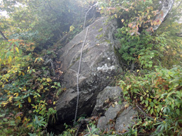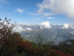 | 大品山から一気に90mを下り、水で剔られ掘割のようになった最低鞍部を過ぎて鍬崎山への登りになった。 足元にゴツゴツした岩が目立つようになり、短い鎖場を越えると1,756m標高点に飛び出し、展望の良い尾根歩きになった。 でも傾斜はきつい。ダケカンバやシラビソ帯から今度はハイマツ帯になり、 鍬崎山山頂12:43分到着。 山頂からは大日岳が一瞬見えたが奥大日や劔岳は雲に隠れている。お弁当を食べながら20分程はっきりしない展望を眺めていたが、 帰りのゴンドラの時間もあり下山開始。下山して間もなく、張り出した木の根に滑って新品のカッパズボンを破ってしまった。 その後も濡れた下山道は滑りやすく思いの外時間がかかってしまい、靴もズボンも泥だらけになった。15:41分ゴンドラ山頂駅着。 |