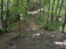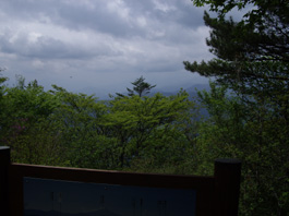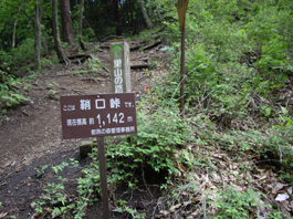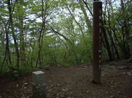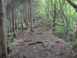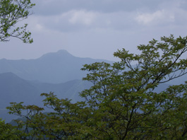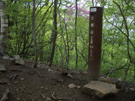 階段状の遊歩道みたいな登り15分位で鞘口峠に着き、三頭山へと緩やかな尾根道が続く。新緑を楽しみながら進むと、分岐になり尾根伝いの山道に入る。人影もなく、木立ちの中に降り注ぐ日の光が新緑の緑の中に踊っていて、とても楽しい登りで見晴らし小屋分岐に着いた。そしてブナ林に入り、新緑に酔いながら、東峰に続く尾根へと登る。すぐに着いた東峰展望台から昨日登った大岳山が見え、御前山も見える。奥多摩三山は三頭山、大岳山、そして御前山だというので、又、機会をみて御前山にも登りたいと思う。そして、三角点のあるピーク中央峰を越え一息下ると、御堂峠に出て、西に登って三頭山山頂(西峰)に到着。