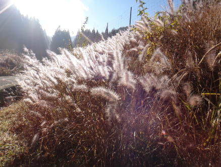 林道脇のネコジャラシに付いた朝露が霧氷になってキラキラと輝き、林道には杉林から漏れた朝日が差し込んでいた。