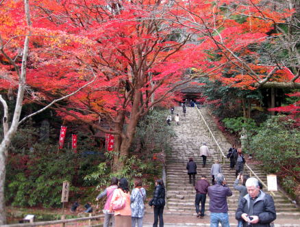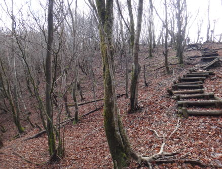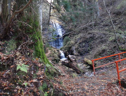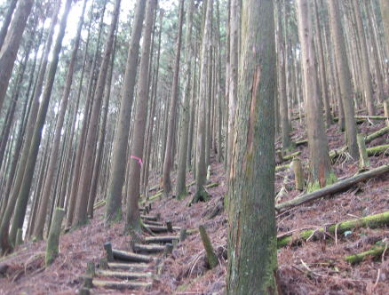 沢沿いの登山道5分位歩くと不動滝に会い、橋を渡って植林内の急なつずら坂を登って行く。