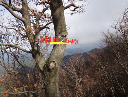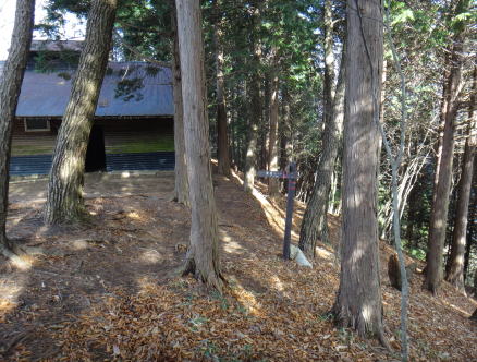 一瞬、三峰山らしき山が見えたが杉林内をひたすら登り、登り尾コースと合流する避難小屋に着いた。
