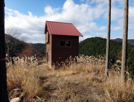 途中、倶留尊山方面の展望を楽しみながら植林内を下り、可愛い小屋前を通り休憩舎や鉄塔のある林道に出た。