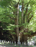 | 痛々しくむき出しになった山肌の向こうには那岐山の山頂が見えていたが、又、杉林に入り、橋を渡ると12:34分登山口に到着。 登山口から車で5〜6分先の菩提寺には、全国名木百選の大イチョウがあるというので寄ってみる。 少し色ずき始めた巨木は900年の樹齢というが生き生きとしていた。そばには杉の大木もあり、 この辺りだけ樹の霊がみなぎっているようだ。法然上人も4年間この寺で過ごしたという。 |