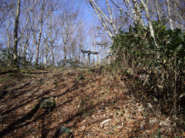 すぐBコース、Cコースの分岐に出て、行きはCコースで帰りにBコースをとることにした。日陰のない原っぱのような中を10分位歩くと林道に出て登山口になった。 ヒノ木林のつずら折れの急登だが、所々にヒノキのベンチが置かれている。登山口から30分位で大神岩に着く。 展望のないヒノキ林の登りだったので、岩の上に登り、眼下に広がる日本原高原を気持ち良く眺める。 そして尾根道を緩やかにすすむと、前方に8合目の標識が見え、木々の背丈も低くなって、展望のきく笹道は那岐山三角点峰に着いた。 |