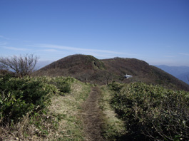 避難小屋の横を通ると山頂に到着。広い山頂はポカポカ暖かく、のんびり休む。三角点峰に2人の登山者の姿が見え、