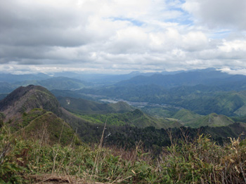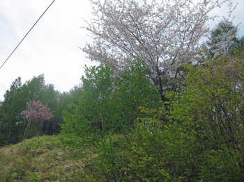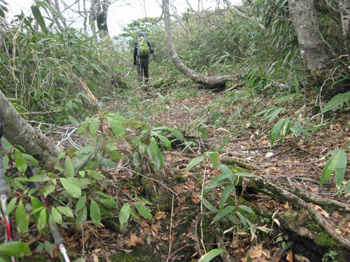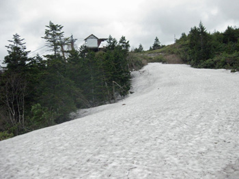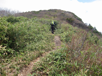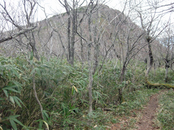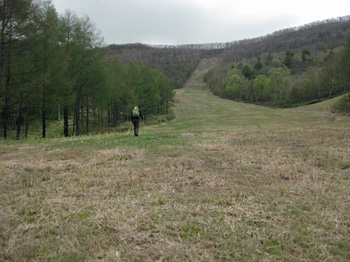 国道352号線の八総から「たかつえスキー場」へ向かう。道なりに進むと会津アストリアホテルに着き、道はここで終わっていたが、会津アストリアホテルのすぐ下の道を左に入ると閉鎖された会津アクシオンホテルまで入ることができた。駐車場所もあったので車を止めすぐにスキー場のゲレンデを登る。ゲレンデの左右どちらかに登山道があるはずと思いながら目の前のゲレンデをどんどん登って行く。傾斜が急になり、振り向くとあまりの急斜面にびっくりする。もくもくと登ってしまったので登山口も見つけないまま、ゲレンデを上り詰め、1420b付近のスキー場の管理道路に出た。