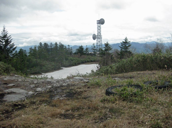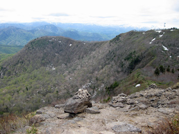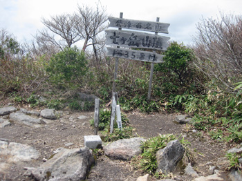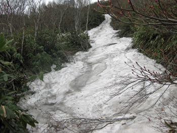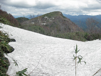 道路は雪が多くなり、30分程歩くとパラボラアンテナが建つ1650bのピークに着いた。残雪が残るピークの周りは深い笹原で登山道らしいところがない。少し下がった建物脇に通路があったので回り込んでみた。裏に回ると七ガ岳が残雪の上に見えた。背の高い笹をかき分けると踏み跡があり、少し進むと登山道に出た。まだ残雪が深く、踏み抜かないよう堅い雪道を進み、大木が横倒しになっている所は通れず笹原をかき分けたりしながら鞍部へ下る。雪がなくなり、七ガ岳を眺めながら緩やかな道を進んで山頂11:28分到着。 |