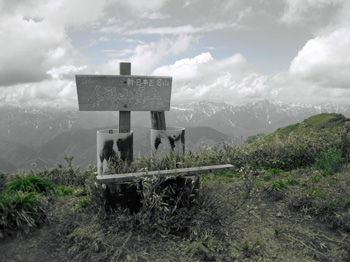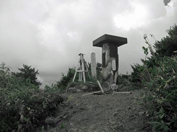 日本300名山山頂と書かれた山頂は狭く通過点の様だが、左の笹原の奥は広く、新日本100名山の標識が立っていた。 人形山は白山の展望の山で白山権現をまつる山だったというが、ちょうど雲が広がってきて展望がはっきりしなくなってしまった。