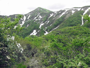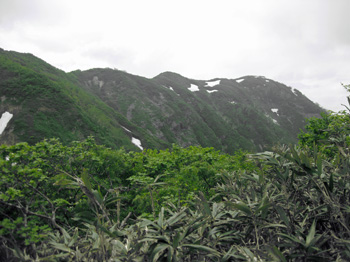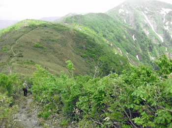 ここは富山と岐阜の県境にあたるという。一組のご夫婦が休憩中でここから戻るというのでお誘いしながら8分休憩して人形山山頂へと向かう。