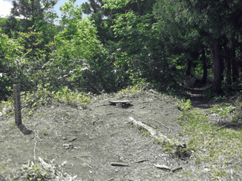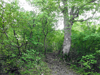 5人の女性グループが休憩中で賑やかな声を背にブナやダケカンバの中の道を進んで第二休憩場に着。