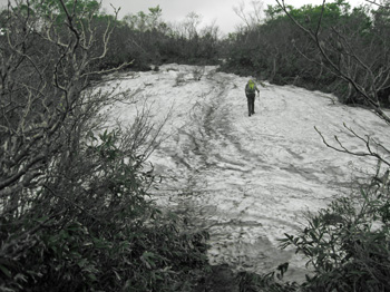 宮屋敷跡から少し下ると残雪の道になった。10分位時々現れる残雪を登り、稜線を見ながら登りきると人形山と三ガ辻山の分岐に着いた。