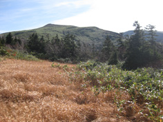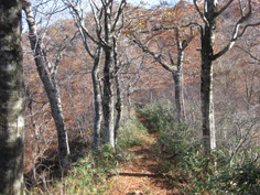 | 大釜温泉に泊まっていたので、孫六温泉にある登山口まで沢沿いの広い道15分位歩く。 もう紅葉は終わり、かすかに残ったびっくりするような鮮やかな葉っぱに感激しながら登山口を8:27分出発。 今日は素晴らしい天気でサクサクと落ち葉を踏み、学生時代の友達と2人の気持ちよい登山だ。ブナ林の中、木段の急な登りが終わると草原に出た。 乳頭山が目の前に広がり、山頂を見ながらの楽しい登り。そして田沢湖も眼前に現れ、田代岱山荘に着いた。 そこには小さな地糖と、緩やかでまるで丘のような乳頭山ののんびりした姿があり、心が和む。 黒湯温泉との分岐に出て、緩やかに登って乳頭山山頂に10:33分到着。 |