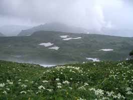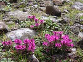 | 雪渓の脇の池 | 岩礫の道にヨツバシオガマ | お花畑が広がる |