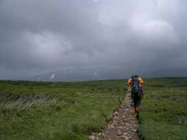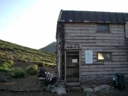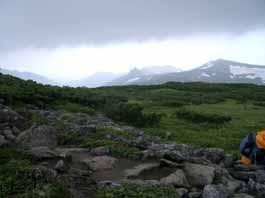 | 朝から雨が降り続いているので出かけるのをためらい、天気予報を確認しながら思い切って、10時頃札幌を出発する。十勝岳温泉、望岳台駐車場に着いたが雨の勢いは止まらず、雨の中を上ホロカメットク山へと出発する。風がないのが幸いで、もくもくと富良野岳への分岐から左に分かれ、ハイマツの急斜面を登り尾根上に出た。左下から噴気のニオイがするが雨と濃霧で展望はなく、急斜面を登り切って稜線上に躍り出る。急に風が強くなって、上ホロカメットク山へ向かうが、頂上を経由せずに直接上ホロ山避難小屋に行くことにした。稜線上から20分位で17:05分小屋に到着。夫と私の他、3組の登山者はみんなずぶ濡れなので小屋の中は湿度が高く、暗い中での食事の支度はてんやわんやだった。今回は上ホロカメットク山〜十勝岳〜美瑛岳〜オプタテシケ山〜トムラウシ山と3泊4日の縦走を計画。初日からの雨は気分が重い。 |