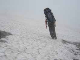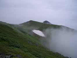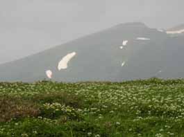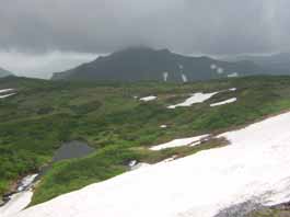石垣山に向かう時、雨がポツポツ降ってきた。稜線上からずーと下、草原の中に美瑛富士避難小屋が見えた。岩礫とハイマツの稜線上の足元にはミネズウオやイワウメが見え、時々ガスがさーと流れて、お花畑や稜線上の山が見え素晴らしい展望が現れる。雨交じりの霧の中で展望がない時、ベベツ岳を通過。そして、オプタテシケ山の頭だけが見えた。目指すオプタテシケ山の山頂ピークは鋭い。岩礫の急斜面を下り、登りになった。ハイマツを縫って急斜面を登り詰め山頂に着いたと思ったら前峰で、流れる霧の中前進し、細い稜線をたどってやっとオプタテシケ山山頂に到着。濃霧と無風のオプタテシケ山山頂だった。山頂から十勝連峰とわかれ、いよいよ大雪山へと向かう。まずは急な下りで、岩れき急斜面を600bほど下る途中、雪渓帯になり視界も利かなく双子池になかなかたどり着けない。30分ほど雪渓の中を迷って、やっと15:05分双子池キャンプ指定地に着いた。雨も降りだし、ヘトヘトになってテントに潜り込む。 |