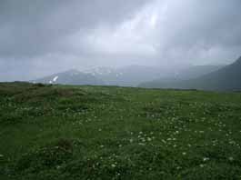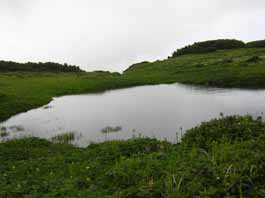 | 3日目 7:00出発。夜通し降っていた雨もあがり、霧がかかっているが今日は晴れそうだ。オプタテシケ山の下りで頑張ったせいか足が重く、リックも重い。双子池キャンプ指定地から背の高い笹原からハイマツの生い茂った登山道になった。濡れたカッパは乾き、暖かくなってアップダウンのない尾根道は快適で、景色を楽しみながらいくつかのピークを過ぎる。ガンコウランやウラシマッツジ等のお花畑で休み、三川台からはユウトムラウシ花園のカールの縁につけられた登山道を行く。右下にユウトムラウシ花園を見下ろし、カール底は蛇行する川、池と雪渓とお花畑の夢のような景色が広がっていた。別世界に迷い込んだ気分に浸りながら、振り返るとオプタテシケ山から昨日歩いた稜線が望めて感激。 |