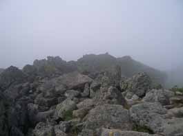 | トムラウシ山に向かって、広大な銀杏ヶ原の一本道を進む。まるで高原歩きのようで草原や岩れき、様々なお花畑やハイマツの中を抜け、1912bのピークに立つと十勝連峰の全容が見えてきた。十勝岳から下ホロカメットク山までの稜線を望め、感無量。そして南沼が現れ、目の前の斜面を登り終えると広い台地の奥にトムラウシ山が鎮座、やっと到着した。うれしく駆け上りたい気分だ。14:05分登り口の南沼キャンプ指定地に荷物を下ろし、テントを張る。1時間半位かかって荷物の整理が終わり、15:30分トムラウシ山山頂へ。トムラウシ山には温泉コースで2回登っている。3回目の今回は長い道のりを経てトムラウシ山山頂に着いたので喜びも一入。30分位の登りで着いた山頂は残念なことに濃霧で被われてしまったが、私には目の前に大雪山から十勝連峰の広がりが想像できた。