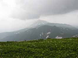 | カール縁のお花畑の道 | ハクサンイチゲの群生 | 十勝連峰の全容が現れた |