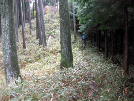 尾根にでると大峠と宮奧の分岐があったが道は笹藪の中だった。
